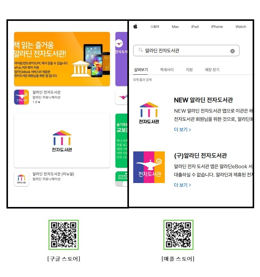 iOS 앱스토어에서 알라딘 전자도서관으로 검색하여, (구)알라딘 전자도서관 앱을 설치합니다.
